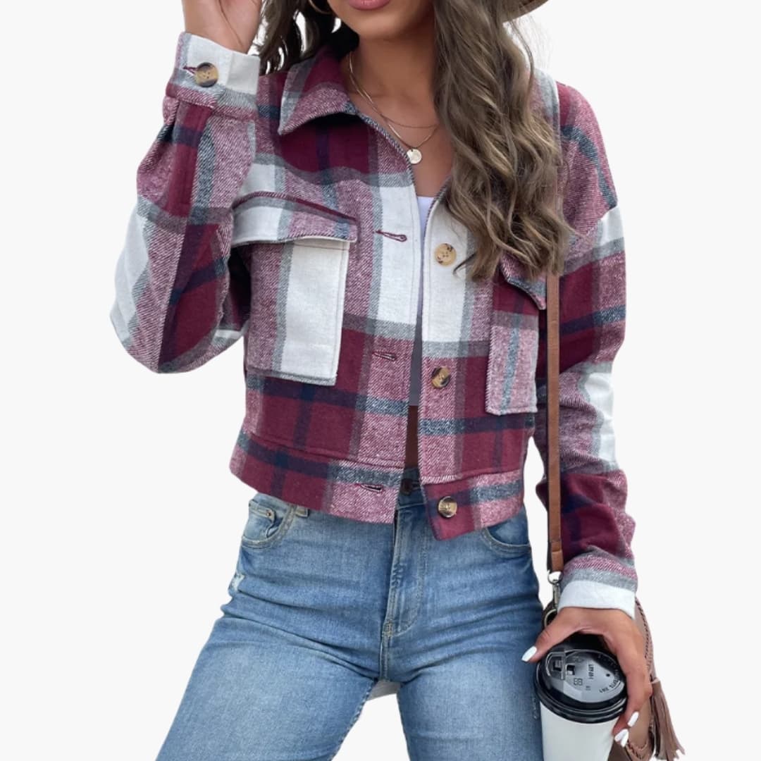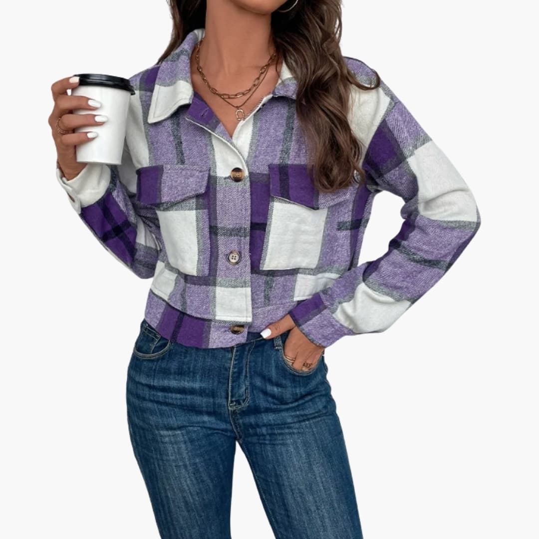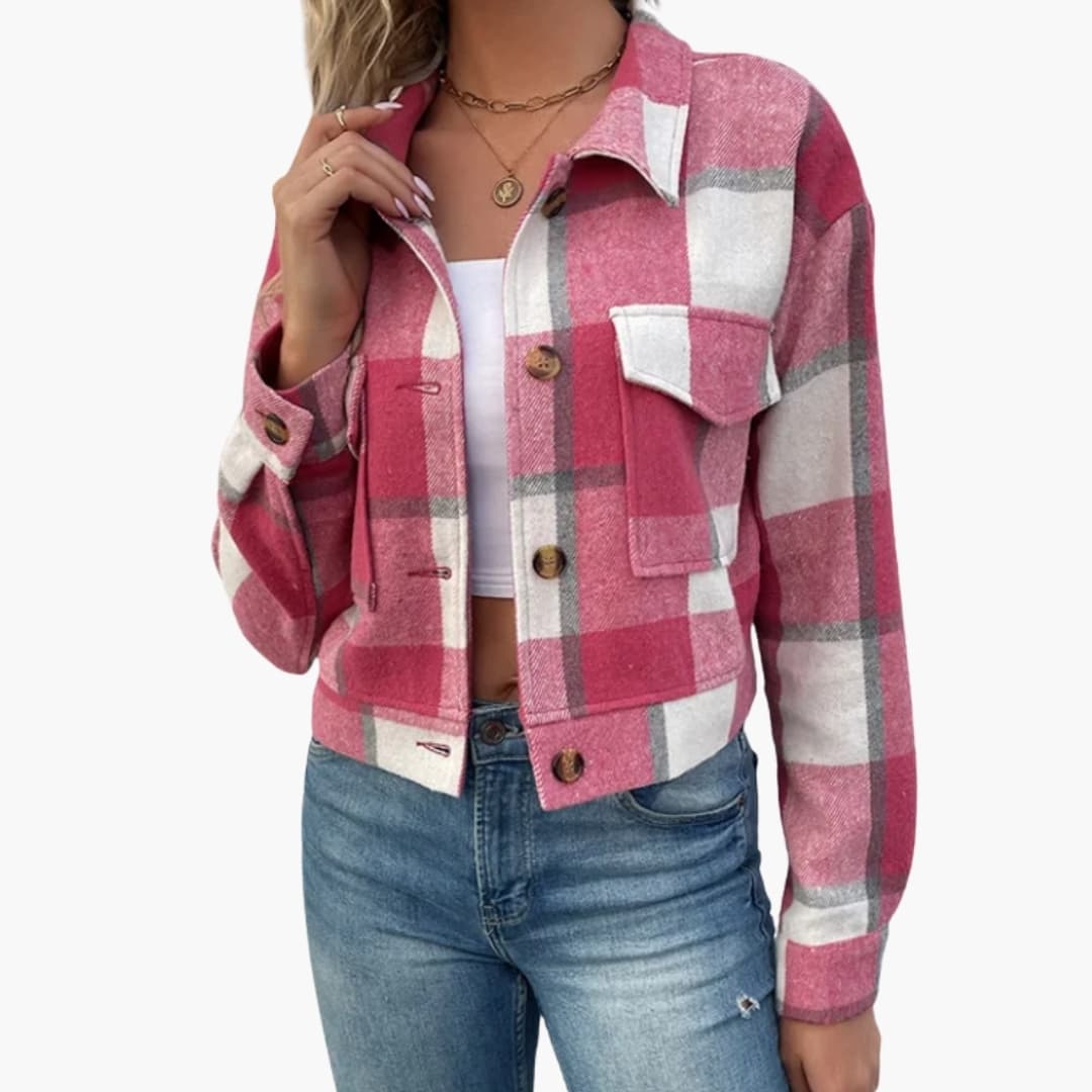 Damejakke med bred krave og kontrastlommer