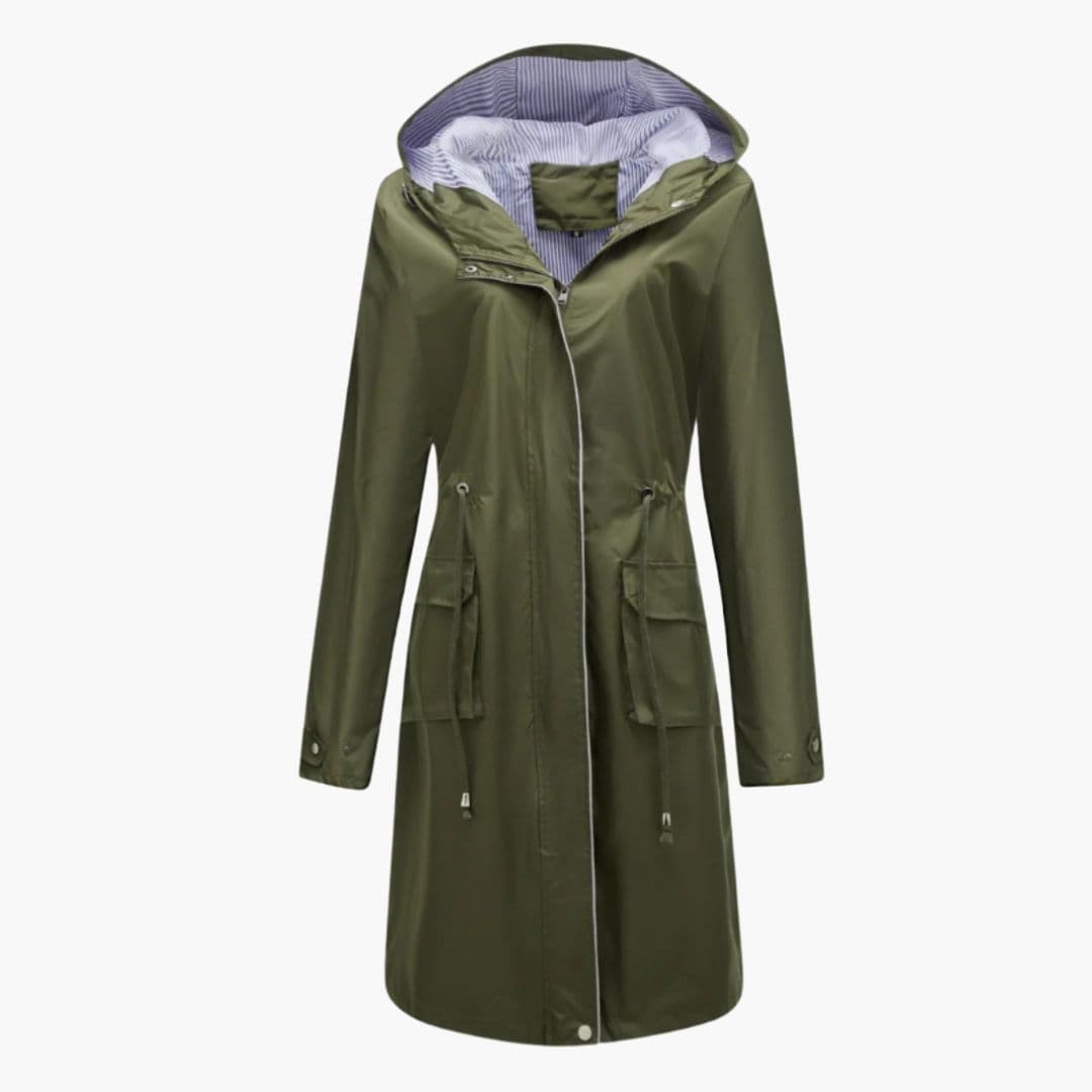 Dame trenchcoat med hætte og klaplommer foran