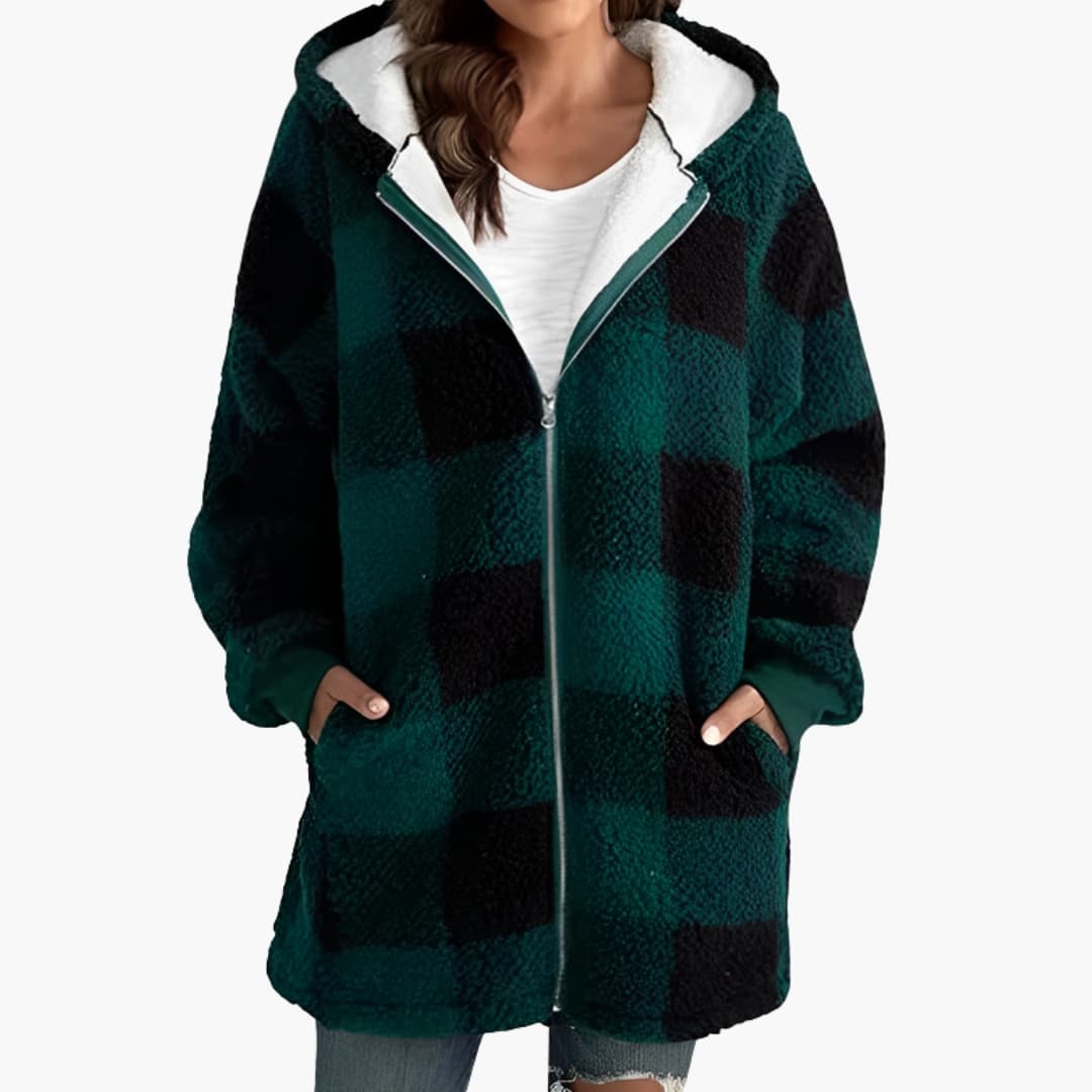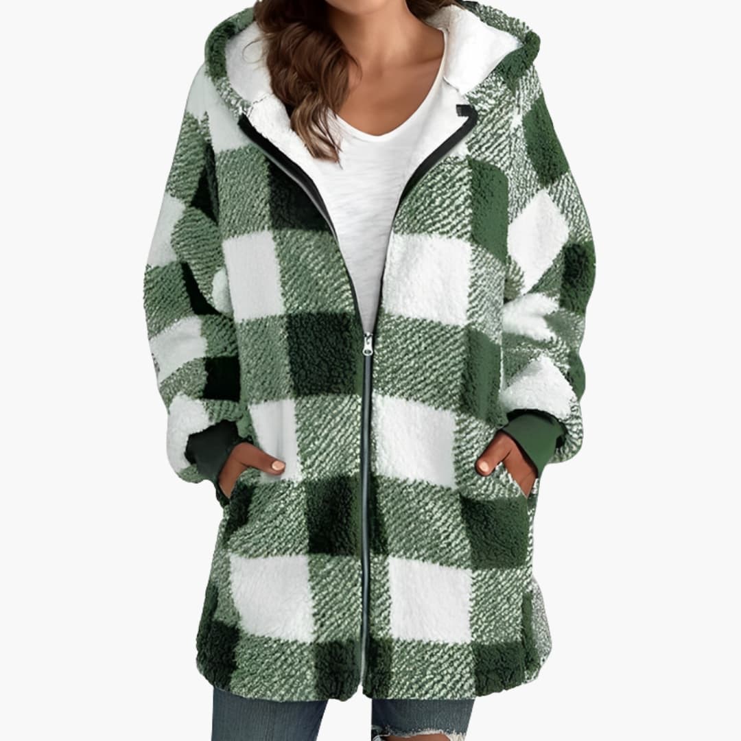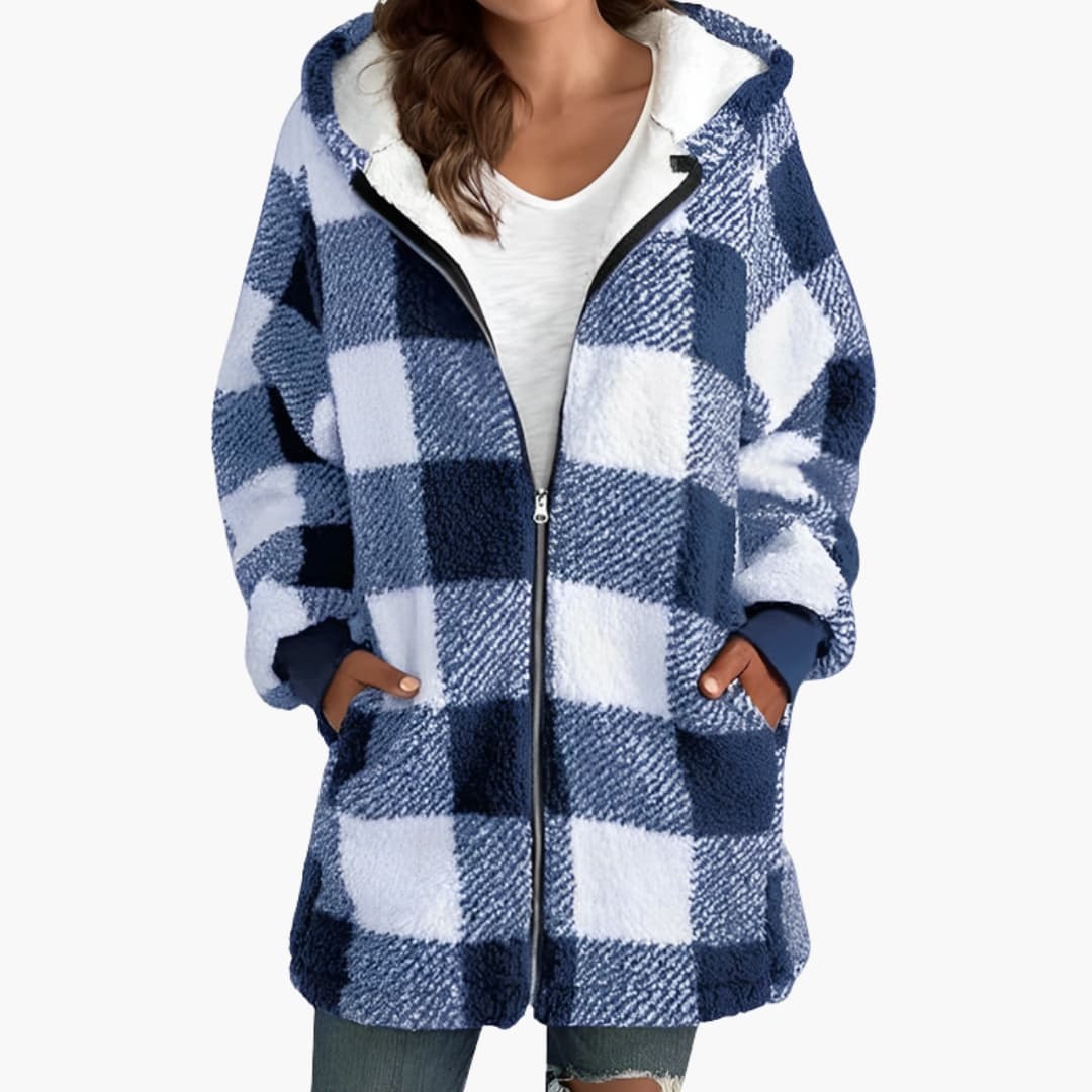 Damejakke med hætte og ternet mønster samt sherpa-for