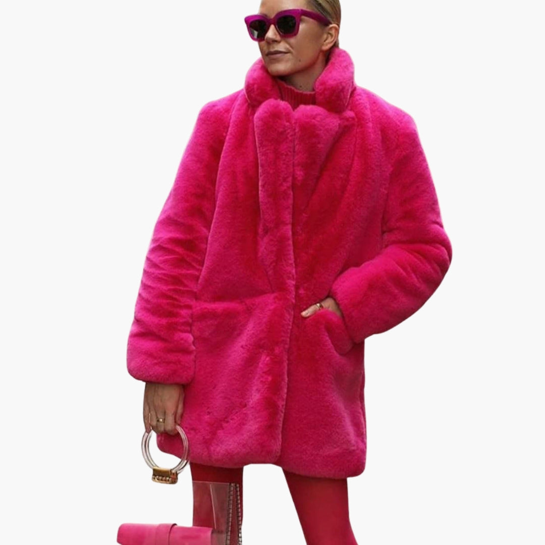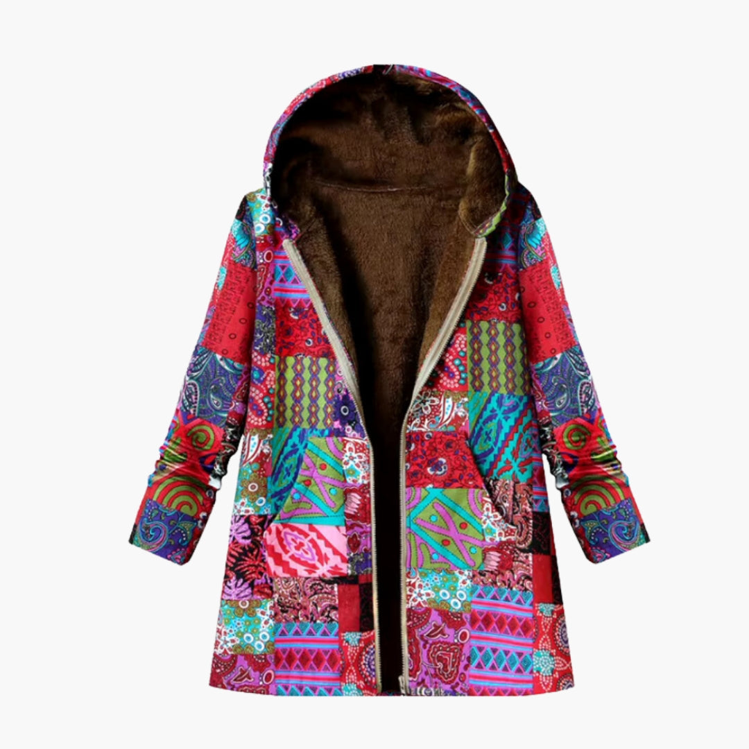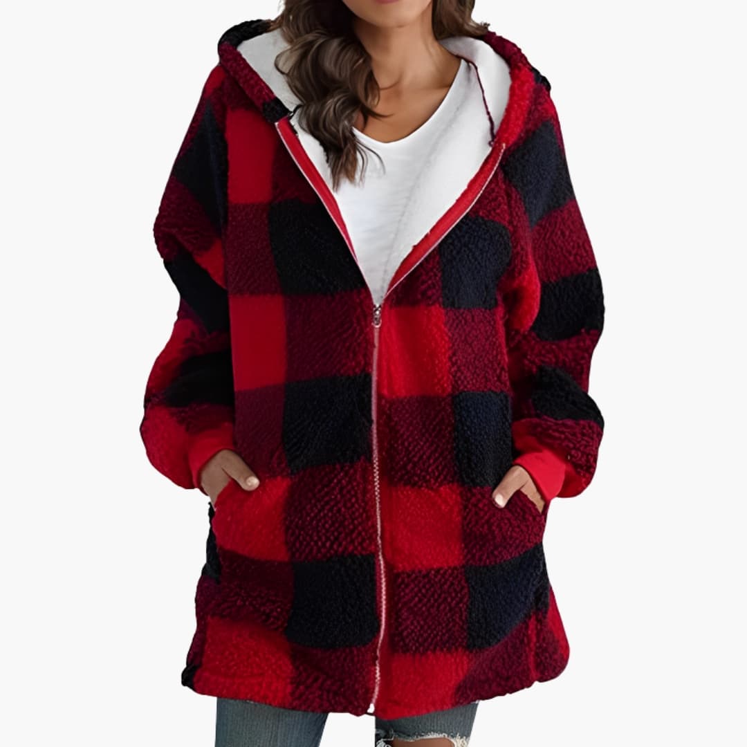 Damejakke med hætte og ternet mønster samt sherpa-for