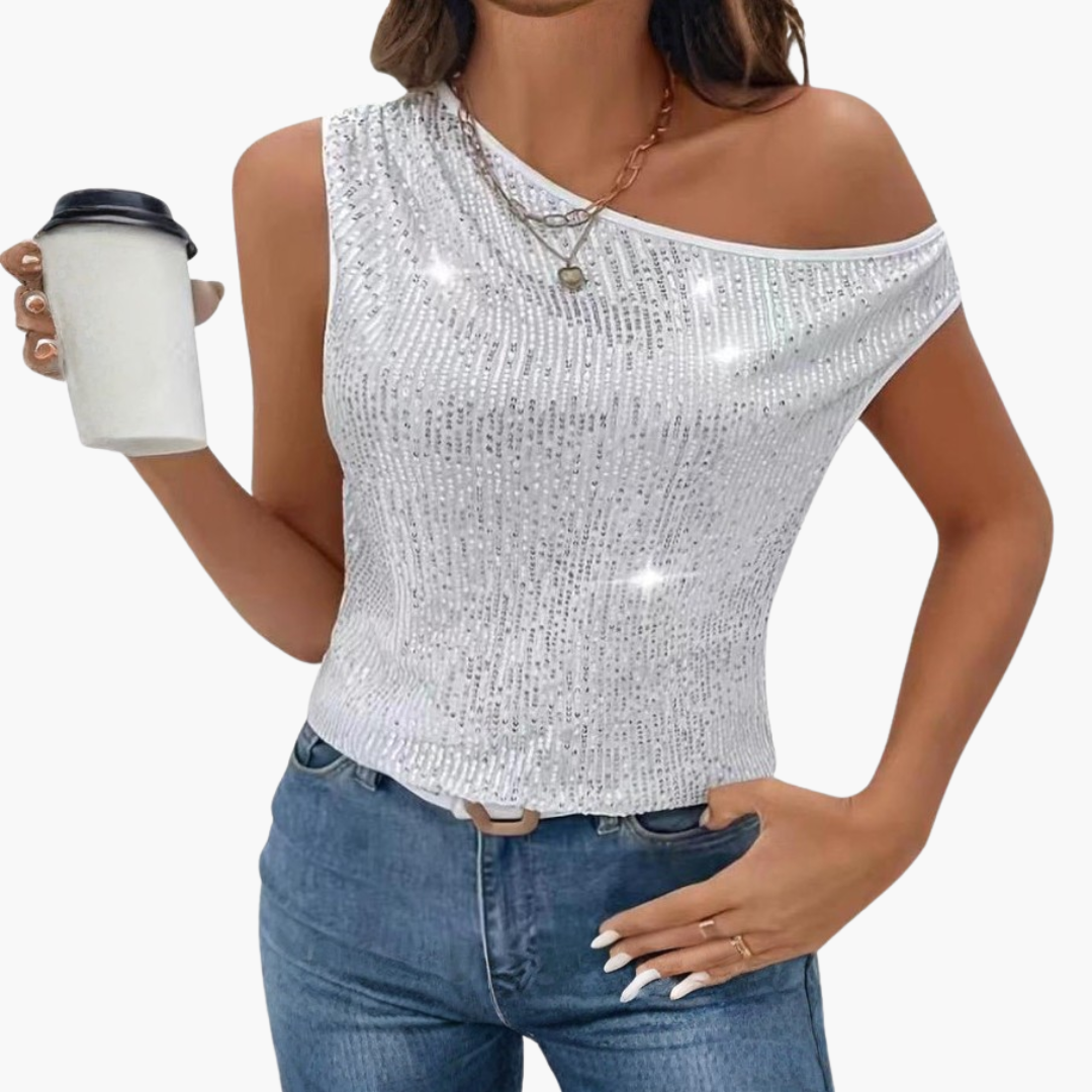Dame top med én skulder og overflade med pailletter og tætsiddende snit