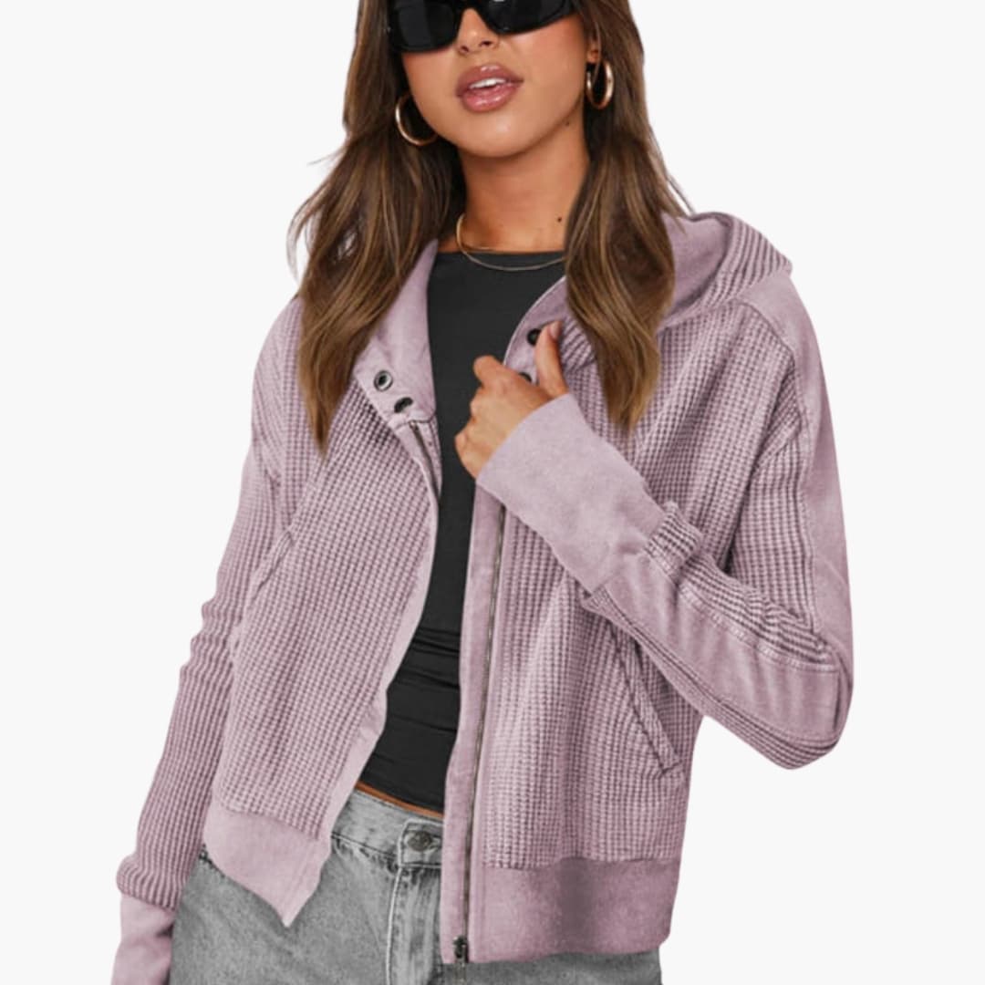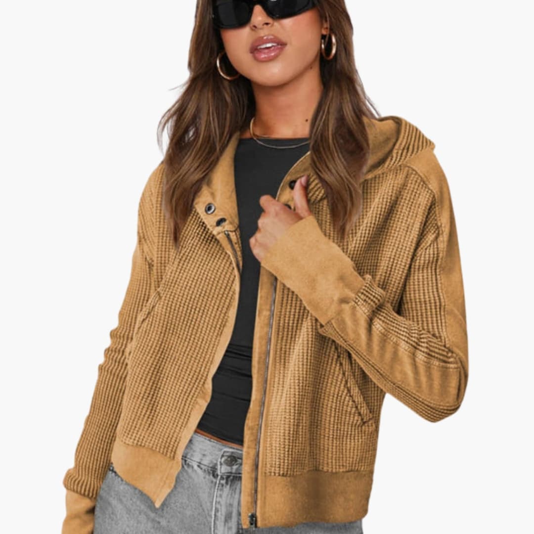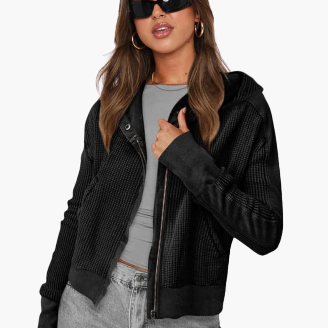 Damejakke med hætte, lynlås og tekstureret overflade