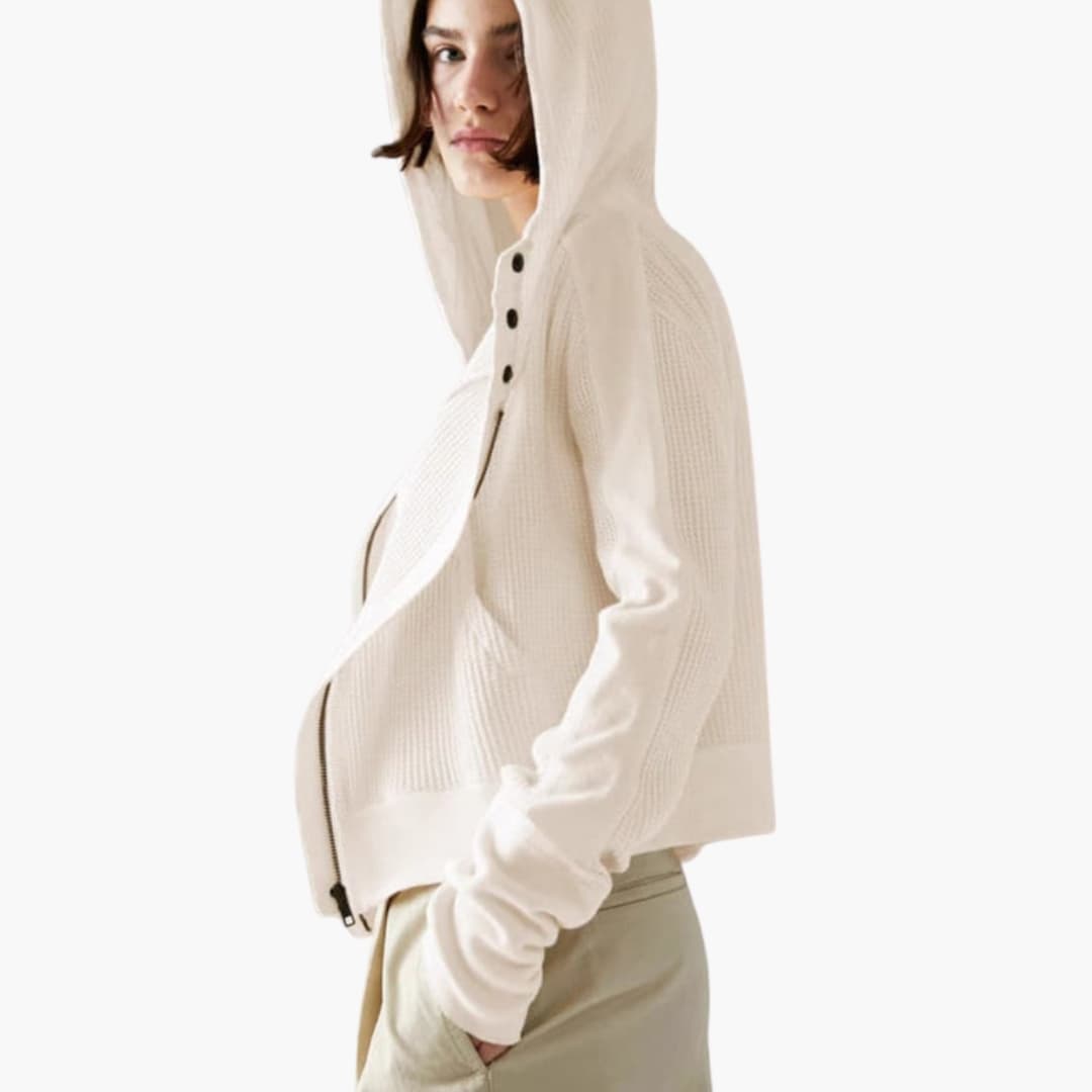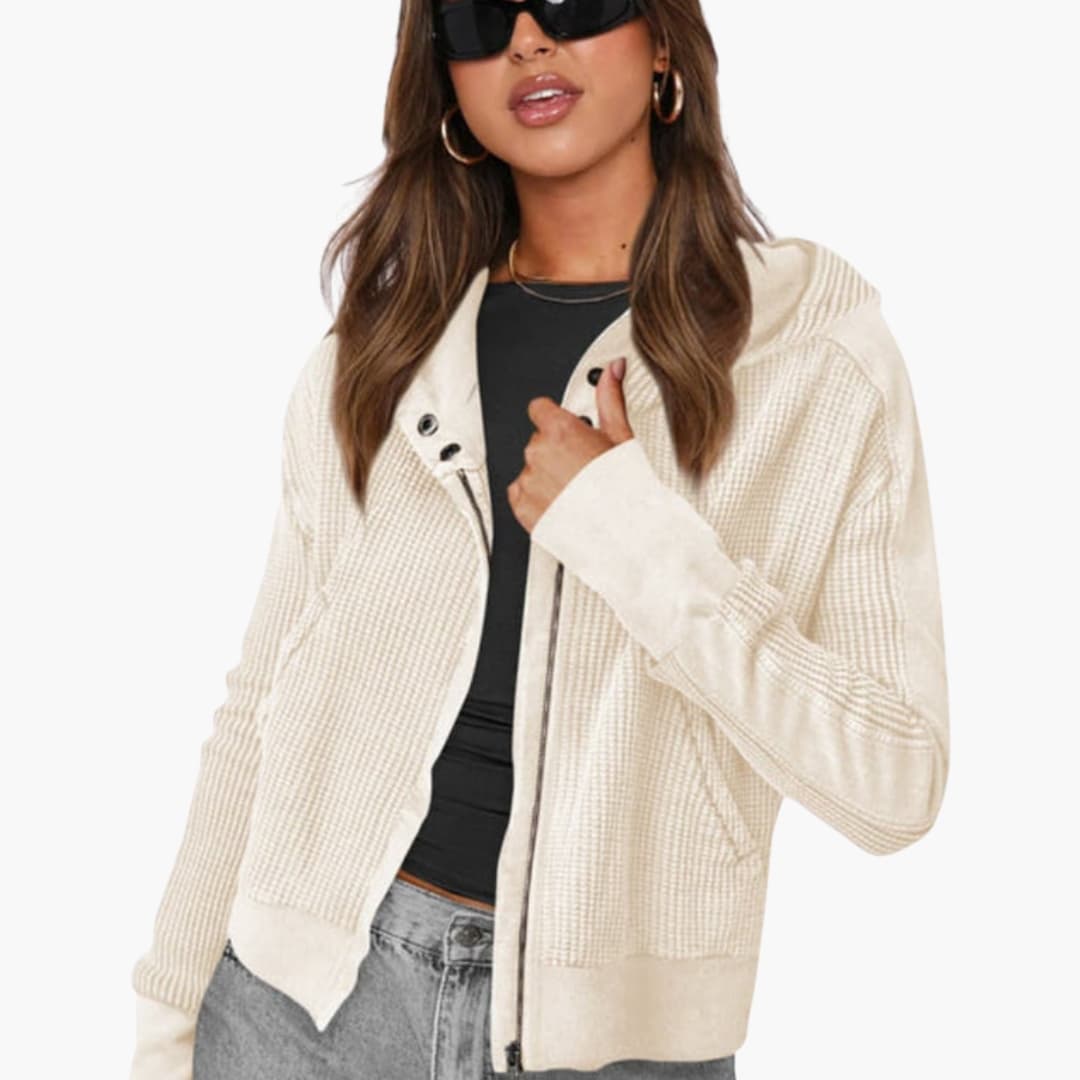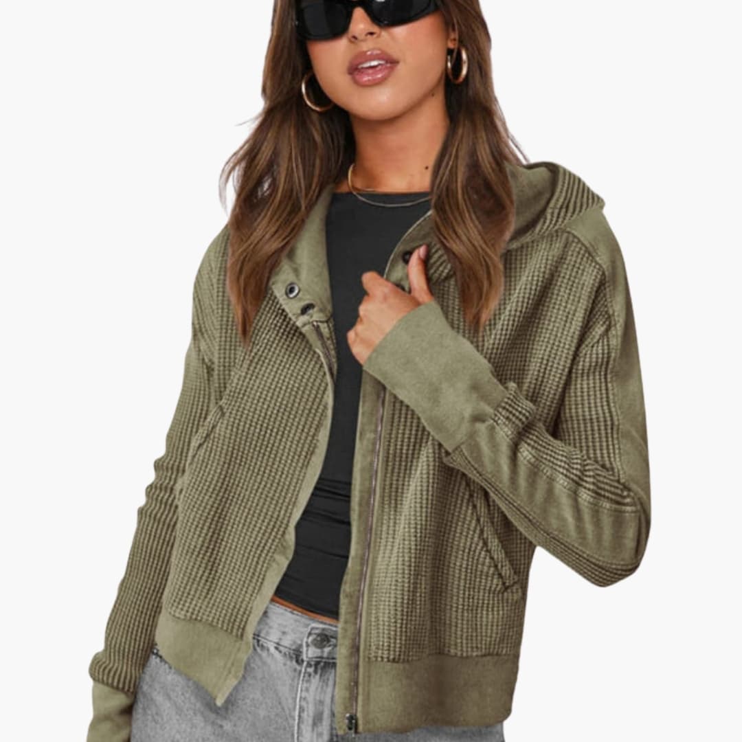 Damejakke med hætte, lynlås og tekstureret overflade