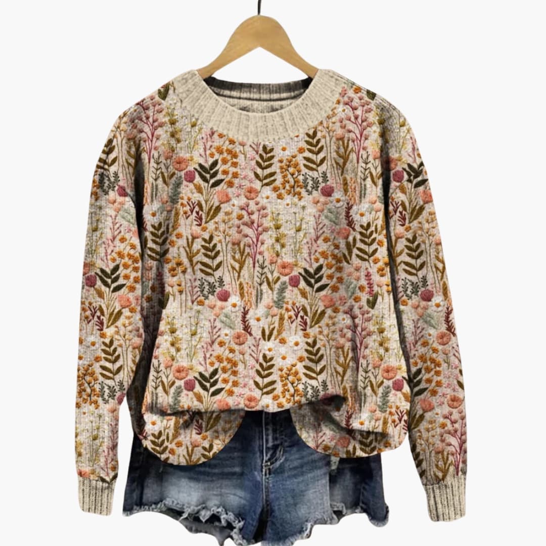 Dame strik med blomsterprint og rund hals