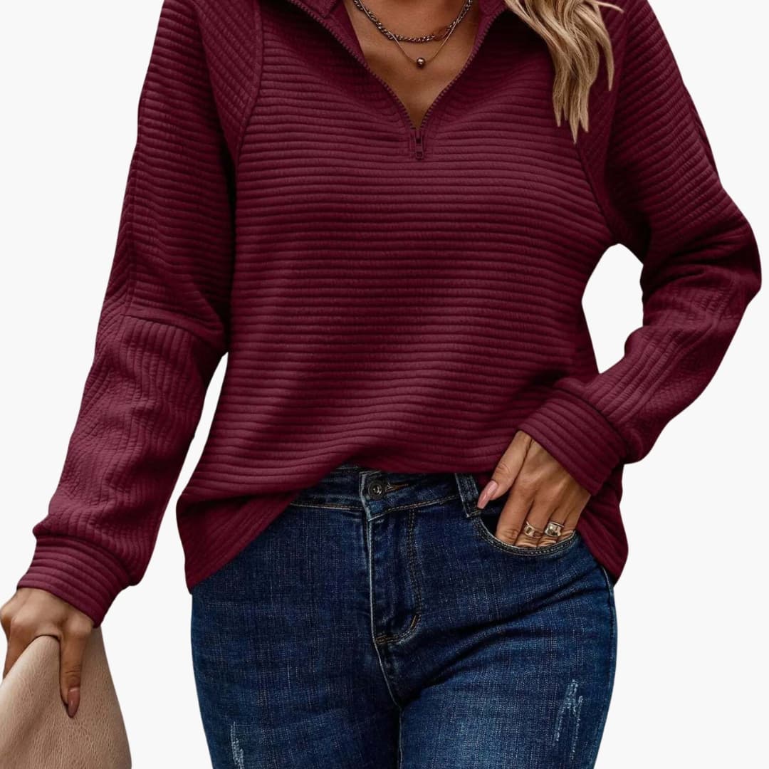 Dame sweater med lynlås og ribbet overflade