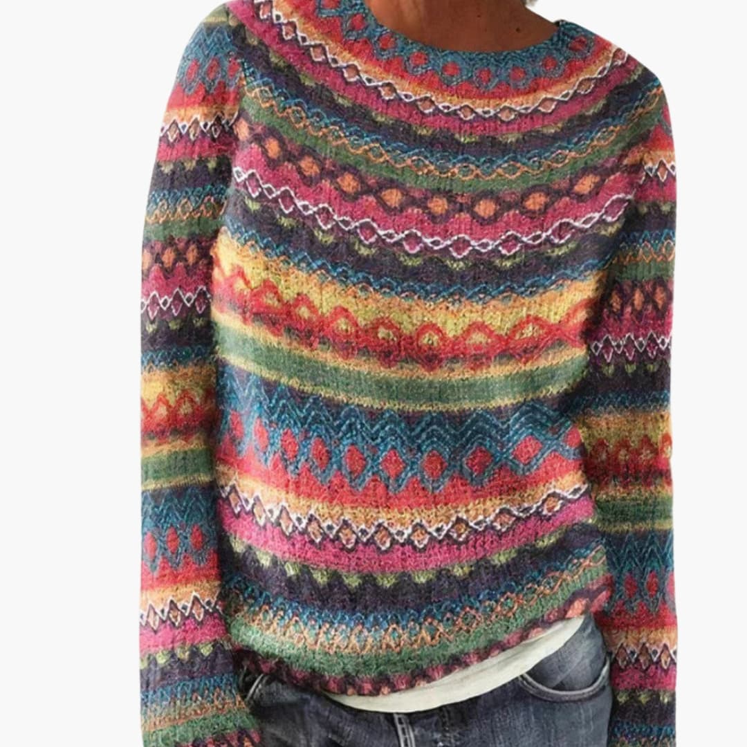 Dame strik med geometriske mønstre og rund hals