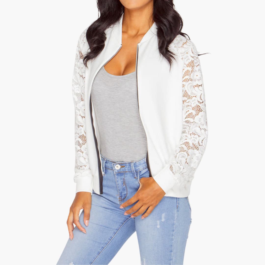 Dame bomberjakke med blondeærmer og lynlås