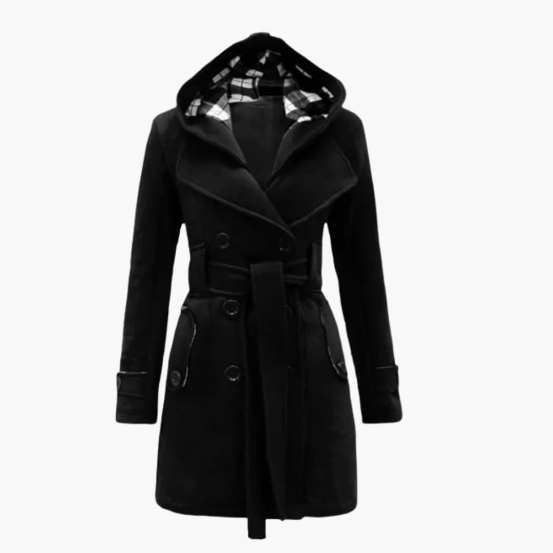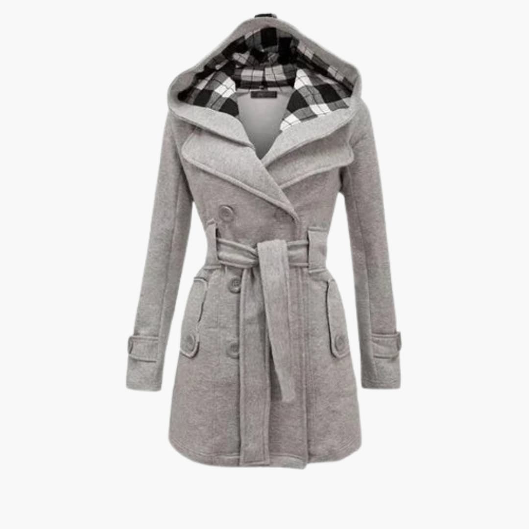 Damefrakke med hætte, bælte og knaplukning