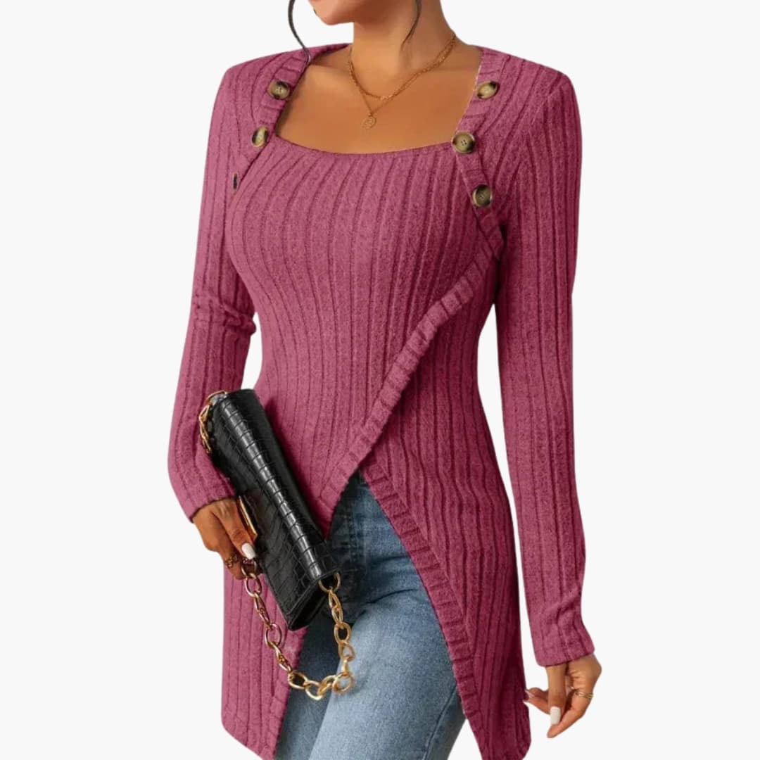 Damepullover med asymmetrisk krave og dekorative knapper
