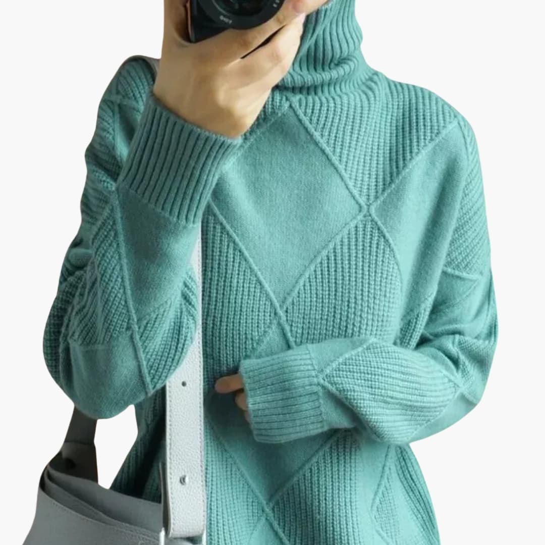 Dame striktrøje med høj hals og geometrisk mønster
