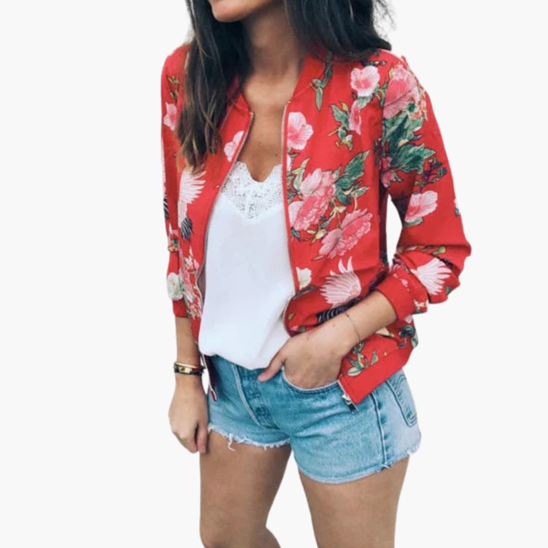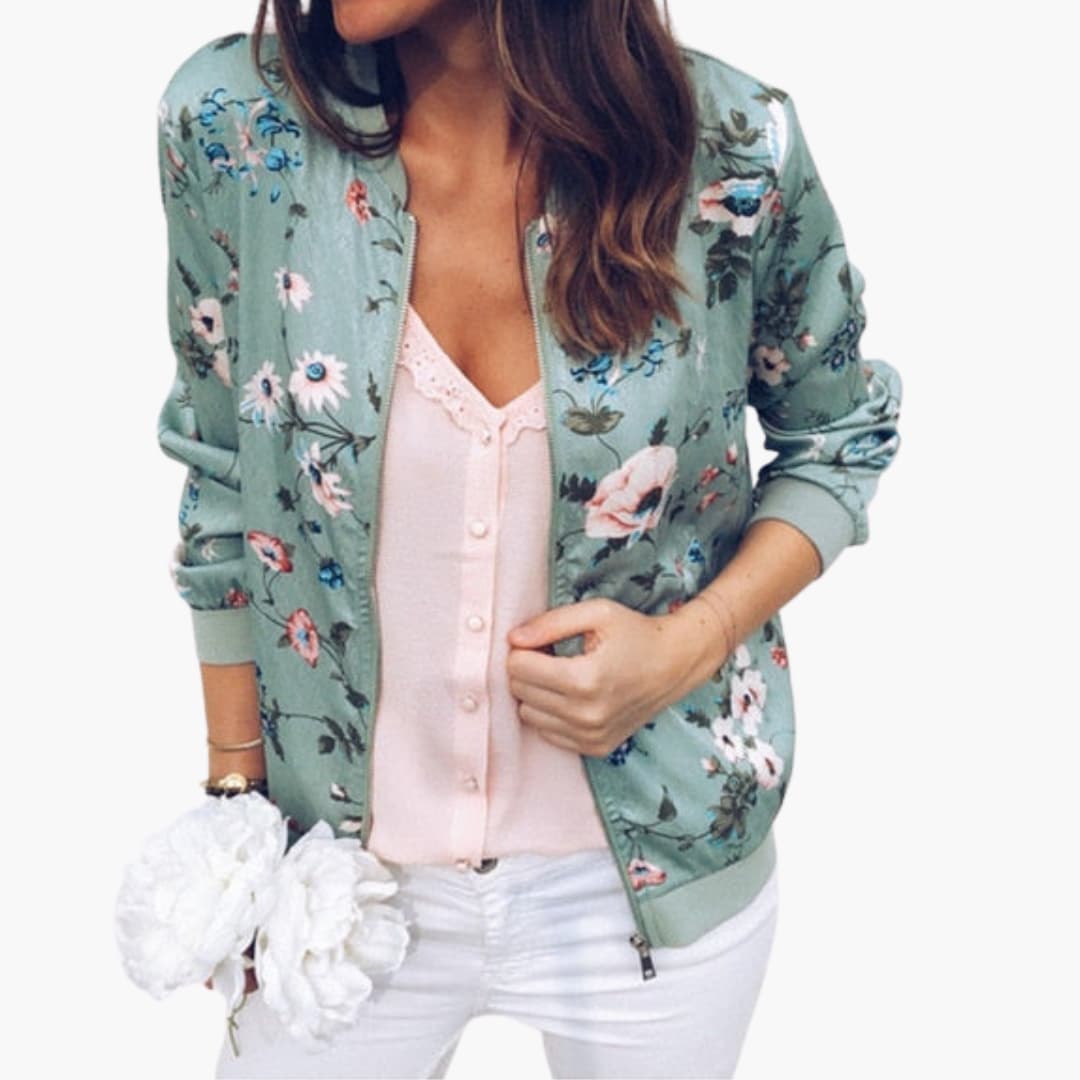 Dame bomberjakke med blomstermotiv og lynlås