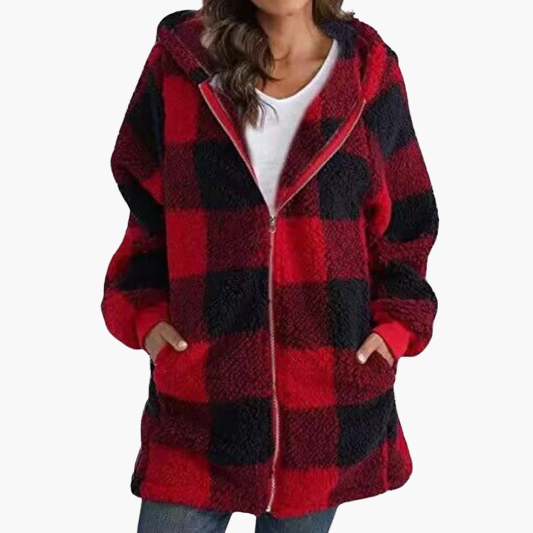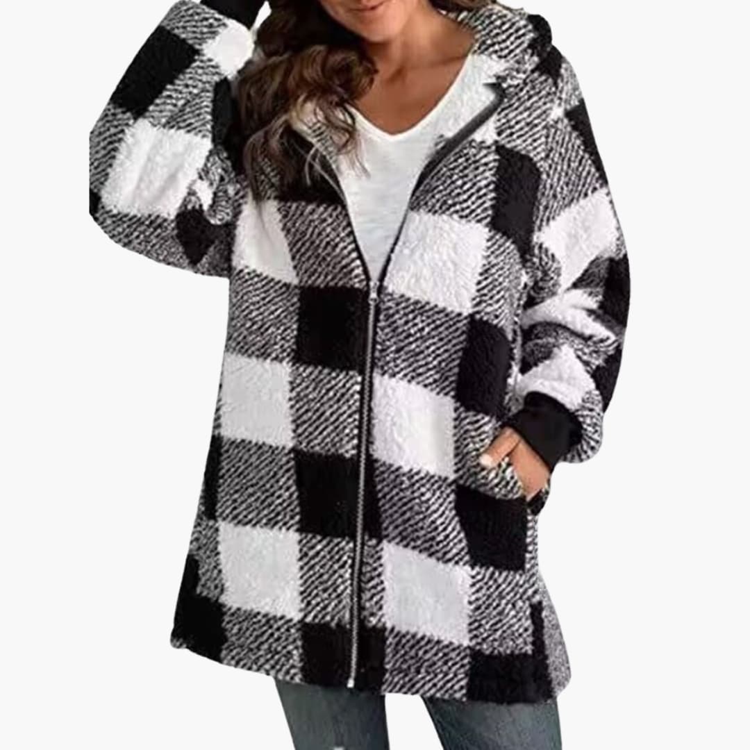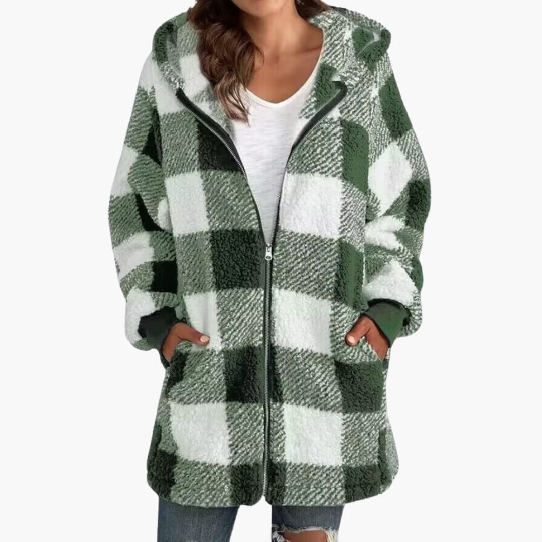 Denne hættetrøje til kvinder har en integreret hætte efterfulgt af en lynlås i hele længden. To skrå sidelommer er placeret foran. De lange ærmer afsluttes med strikkede manchetter. Snittet går ned under hofterne, og den udvendige overflade viser et ternet plaidmønster med tekstureret finish.