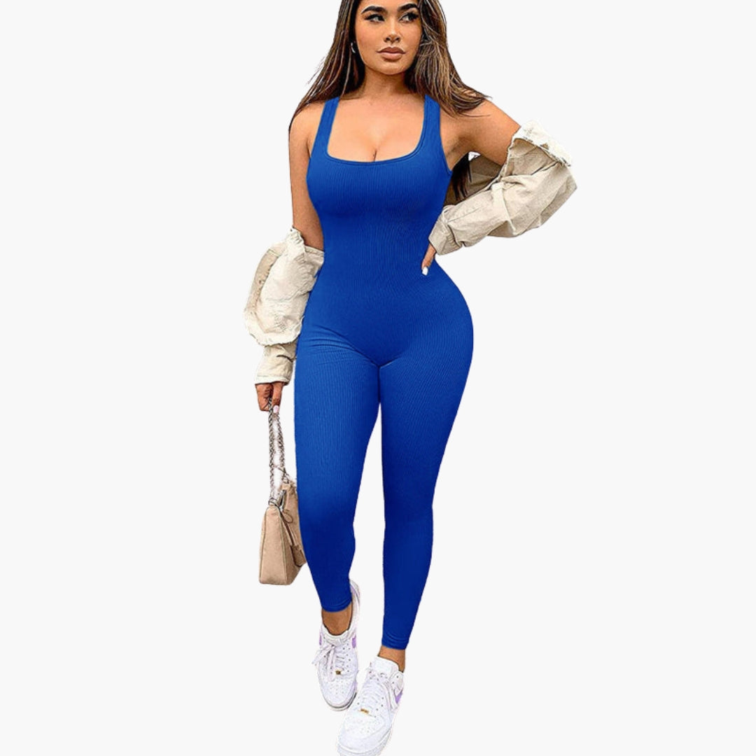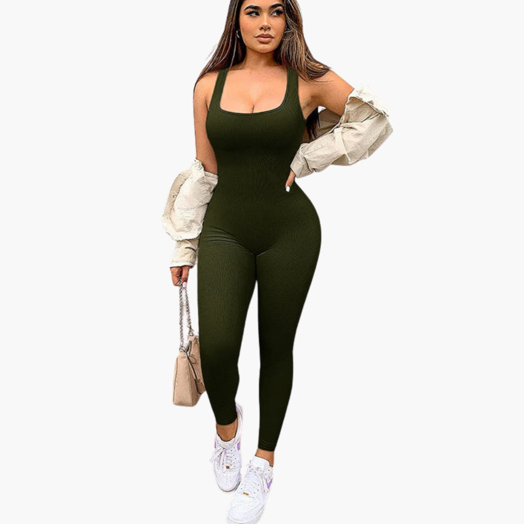 Dame jumpsuit med firkantet halsudskæring og ribbet overflade