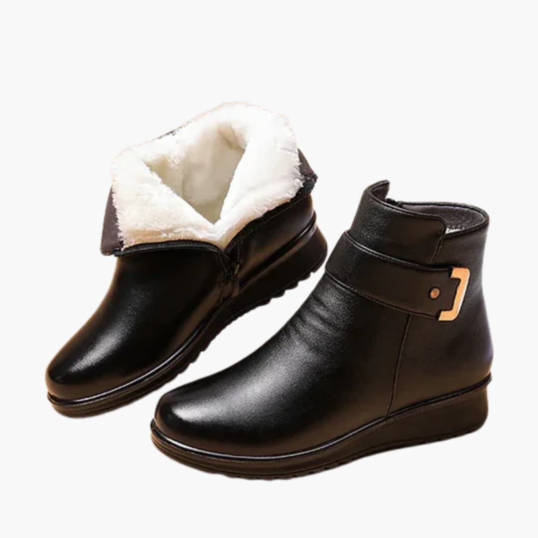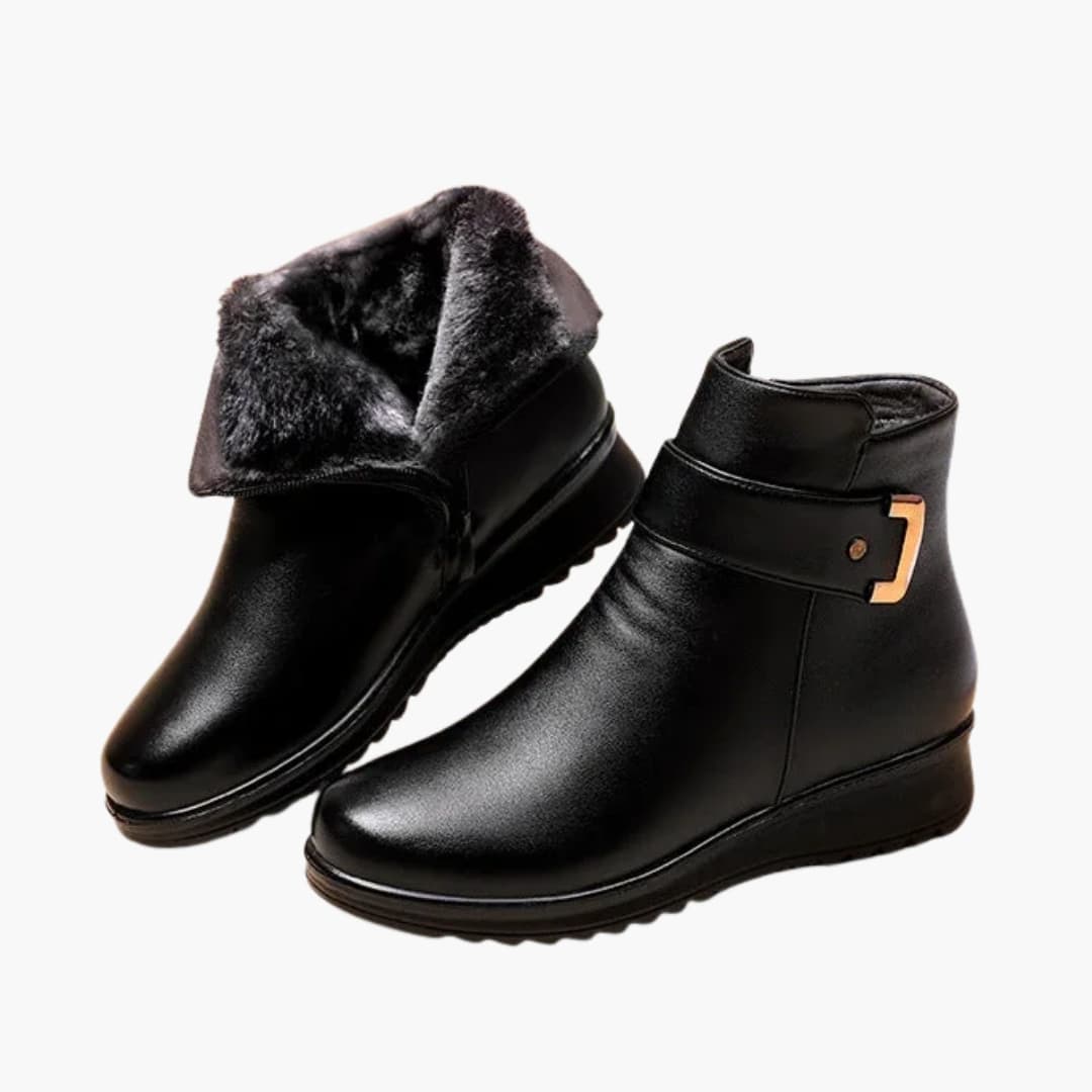 Disse dame støvletter har en ensfarvet overdel med rund tå og en lynlås placeret på siden, hvilket muliggør hurtig påtagning. Indersiden er helt foret med falsk pels, der strækker sig op til anklen for at holde varmen. En dekorativ rem med metalspænde er placeret på den ydre side. Den flade sål med skridsikre relieffer fremmer grebet på jorden under forskellige forhold.