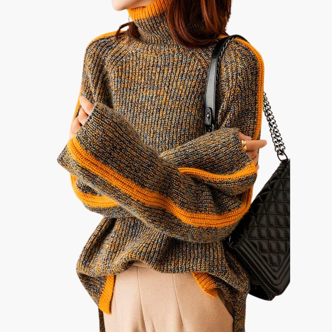 Denne striktrøje til kvinder har en høj hals, en afslappet pasform og lange, hængende ærmer. Modellen har ingen lommer og afsluttes med en lige kant med små sidesplitter. Den ribstrikkede kvalitet afslører et tofarvet mønster med kontrastkanter ved halsen, ærmerne og kanten.