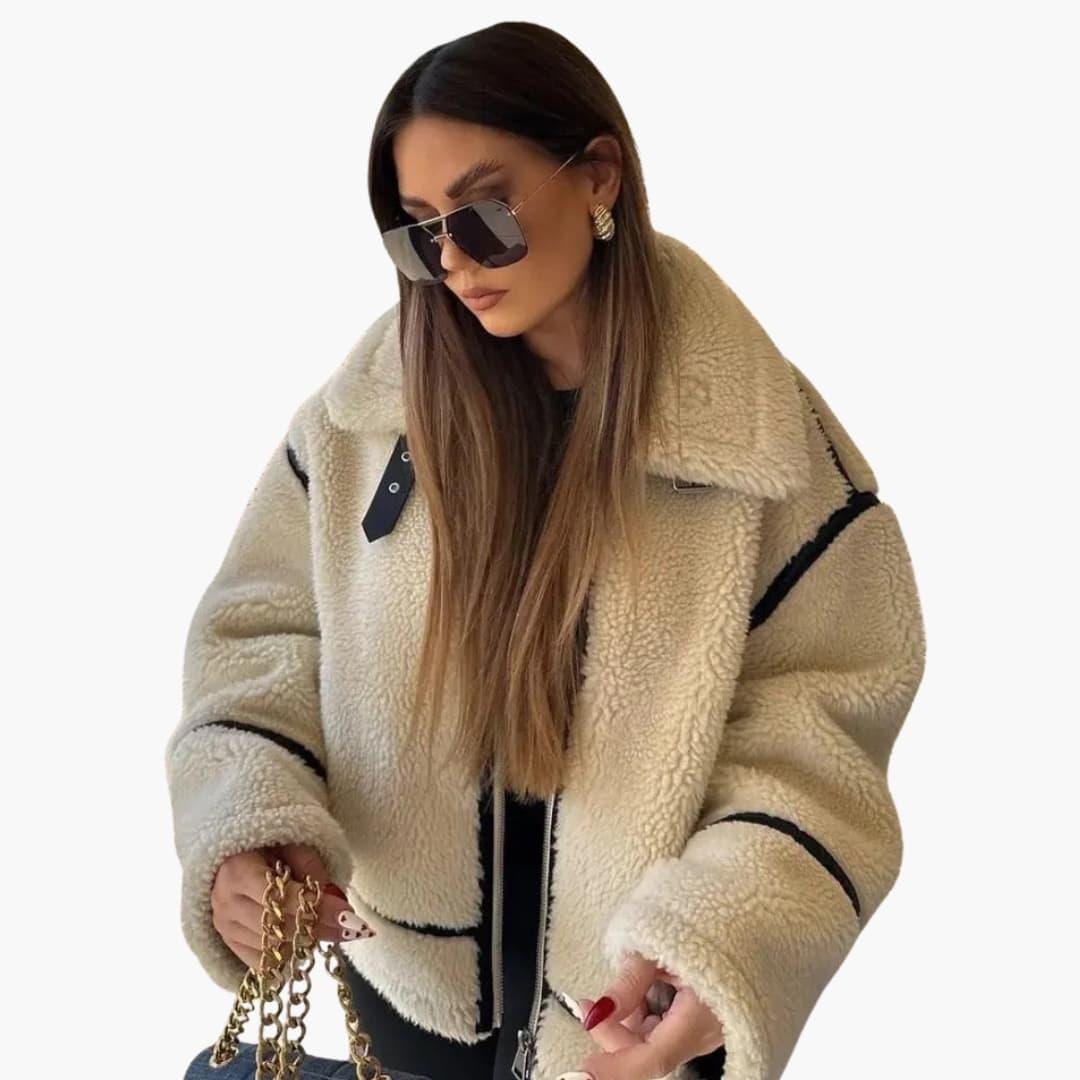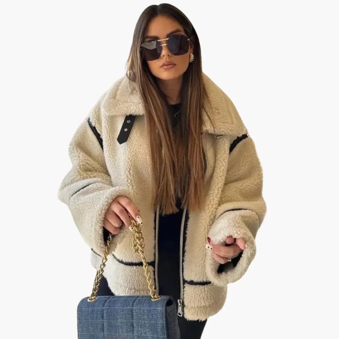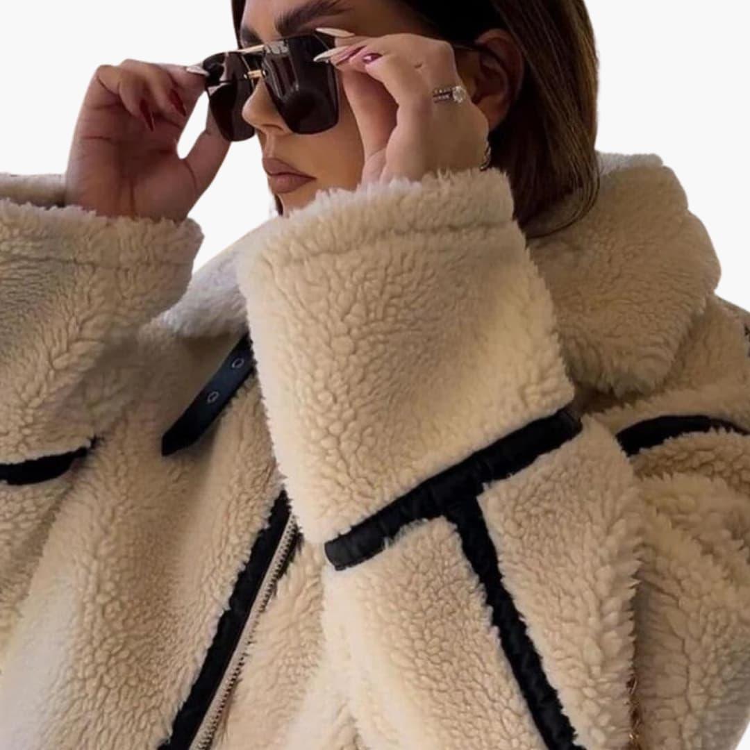 Denne dame teddy-jakke har en bred ombukket krave med bånddetalje og en central lynlås foran. To lodrette sidelommer er placeret i hoftehøjde. De lange ærmer afsluttes med enkle manchetter. Den lige kant falder under hofterne, og den ydre overflade har en teddy-effekt.