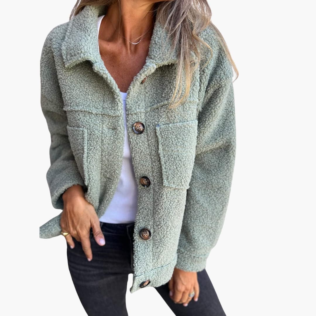 Damefrakke i lige snit med reverskrave og knaplukning.
