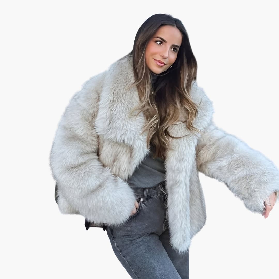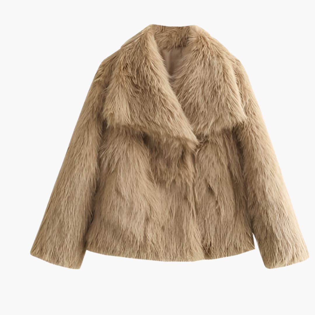 Damejakke i falsk pels med bred krave og lange ærmer.