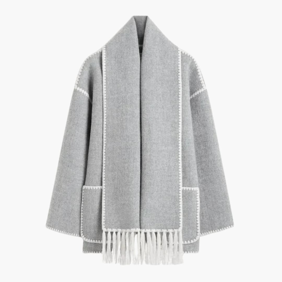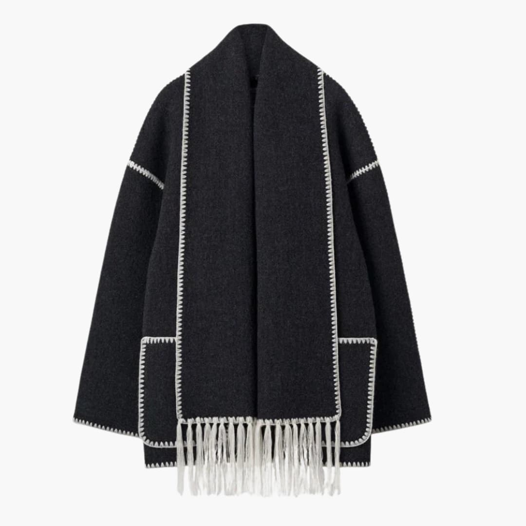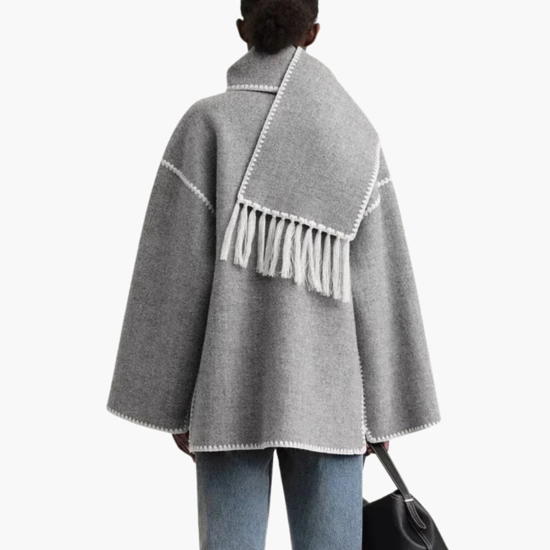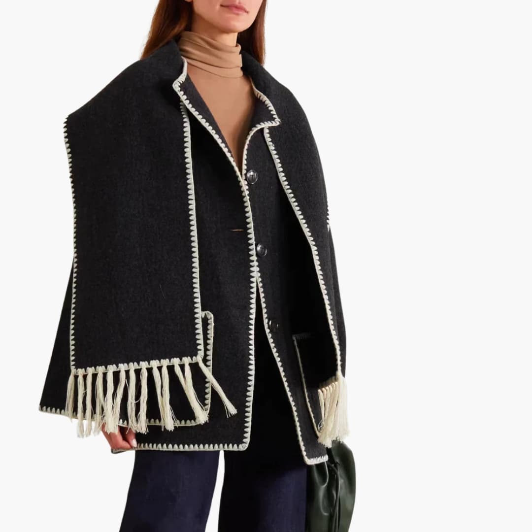 Damejakke med knaplukning og integreret fransesjal.