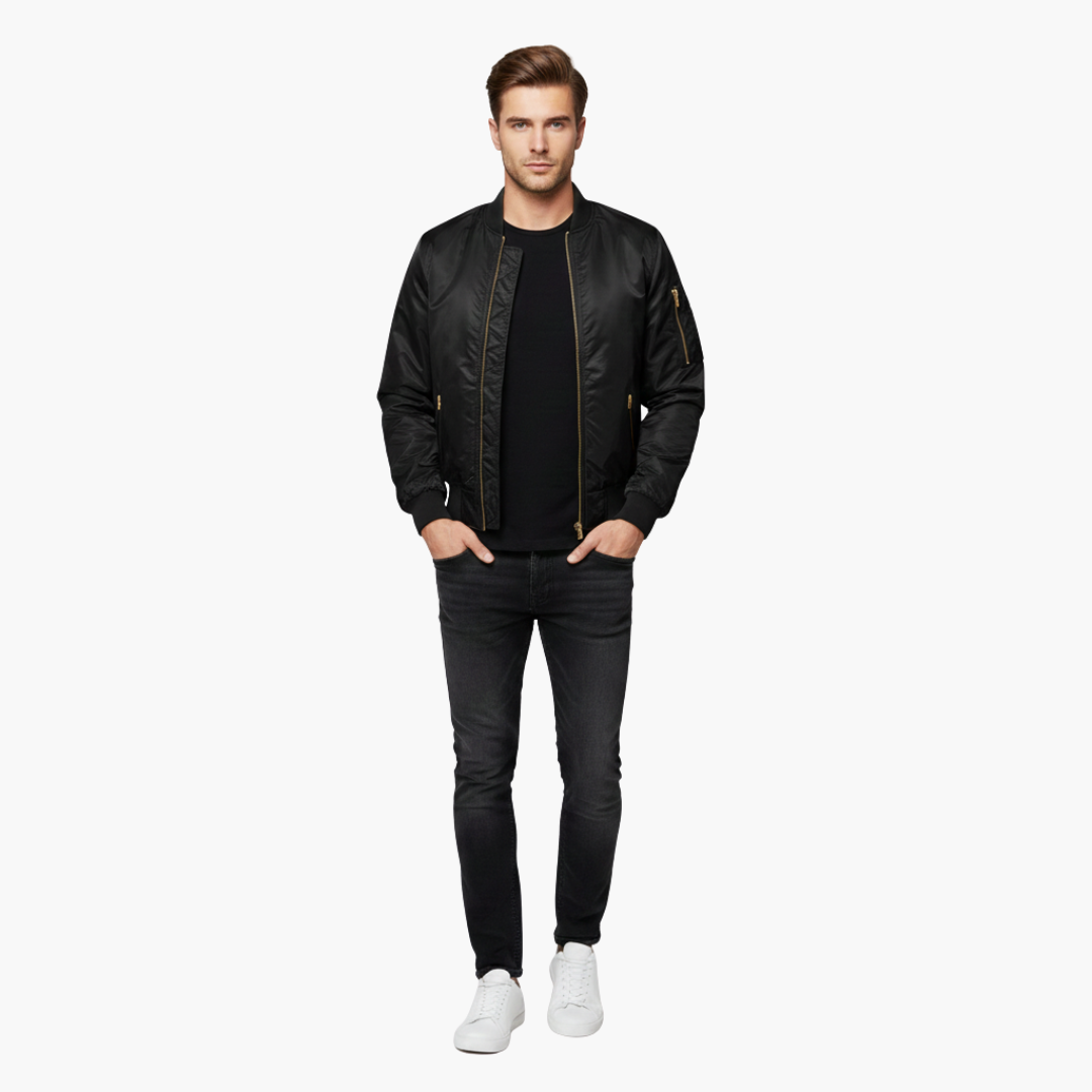 Denne herrebomberjakke har en ribbet krave og en fuld lynlås. Den har lange ærmer med en lynlåslomme på den ene arm og lynlåslommer i siderne. Indersiden har et polstret for med diamantstikninger. Kant og håndled er ribbet, hvilket fuldender den klassiske stil.