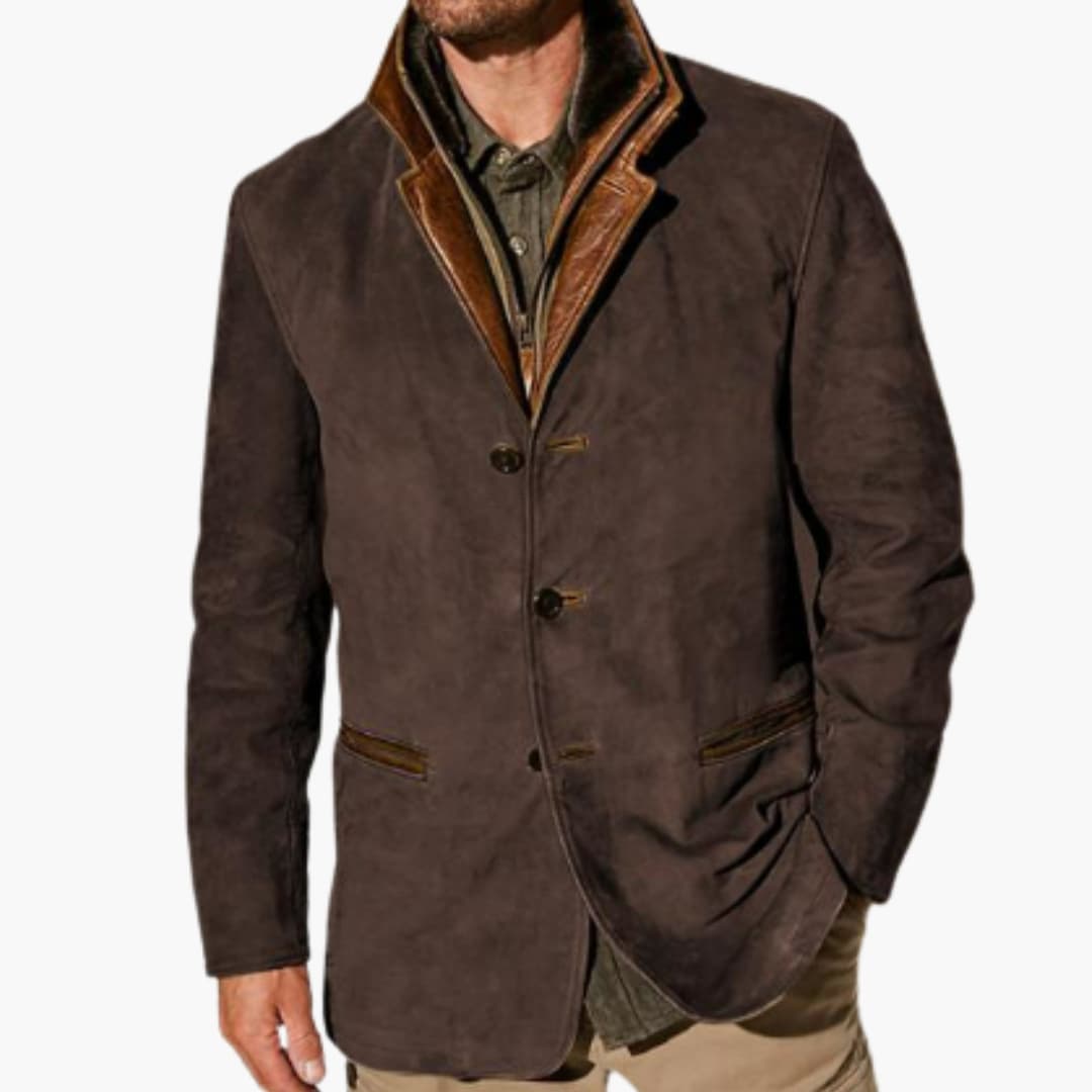 Denne herrejakke har en reverskrave med markeret struktur og en frontlukning med knapper. Den har to sidelommer med paspolering og vandret åbning samt lange ærmer med lige manchetter. Kantene er lige, let afrundede for et moderne look. Overfladen er ensfarvet med en ruskindsstruktur, der fremhæver et pænt og nutidigt udseende.