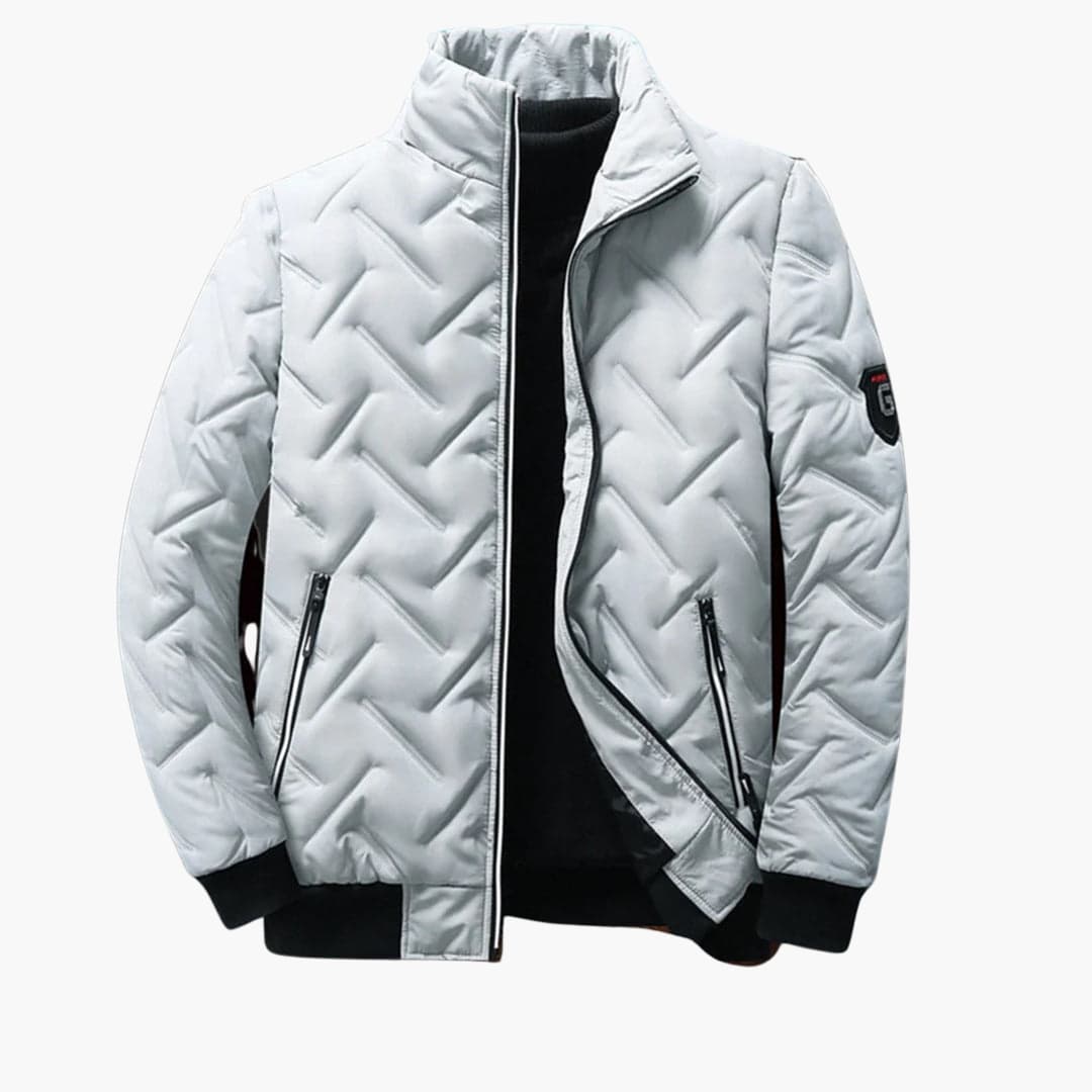 Quilted herrejakke med lynlås, høj krave og ribkant forneden.