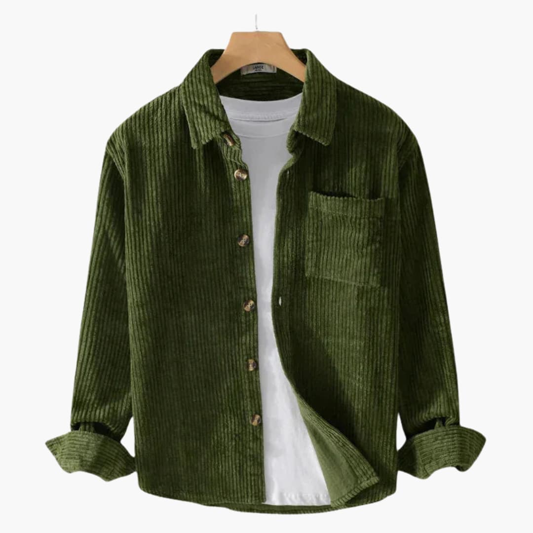 Denne herreskjorte har en reverskrave og en knaplukning hele vejen ned. Den har lange ærmer med knapmanchetter og en brystlomme. Den ribbede fløjlsoverflade tilføjer struktur og dybde, hvilket gør den ideel til at blive båret over en let top eller alene i overgangsvejr.