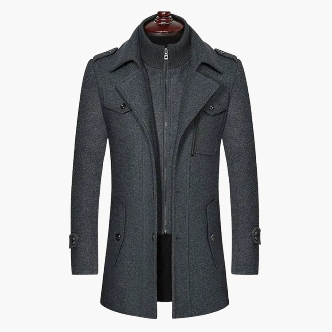 Lang herremantel med reverskrave og flere praktiske lommer.